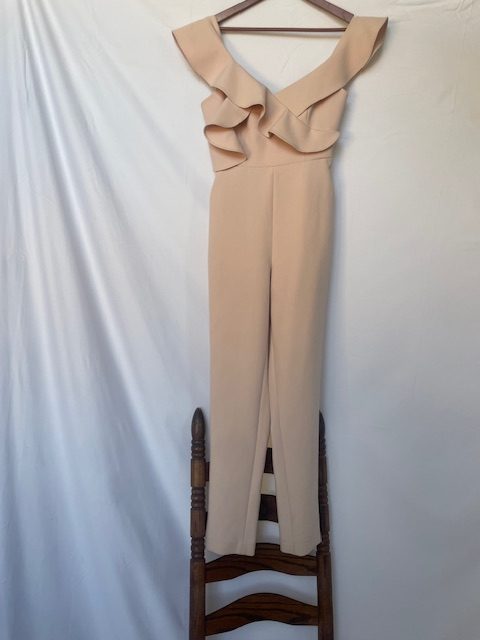 Turn heads in this stunning blush pink jumpsuit by BCBG. The feminine silhouette is elevated by its soft color and impeccable tailoring. Designed for effortless elegance, this jumpsuit features a flattering cinched waist and wide-leg pants, making it ideal for weddings, brunches, or formal dinners.