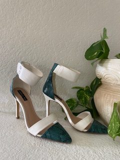 Add a pop of elegance to your wardrobe with these striking white and green heels from Zabella Rue. The pointed toe and slender stiletto heel create a graceful silhouette, while the unique color combination and snake-print texture add a touch of bold sophistication.